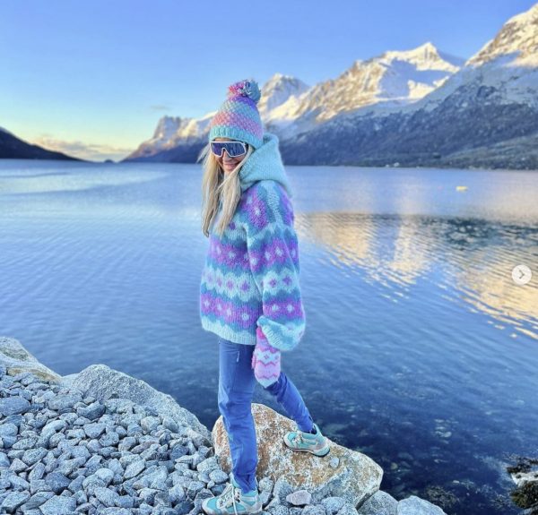 Denne versjonen av Istind genseren er strikket i Hip Wool. En deilig genser med nydelig mønster og farger designet av Pudderpiken.