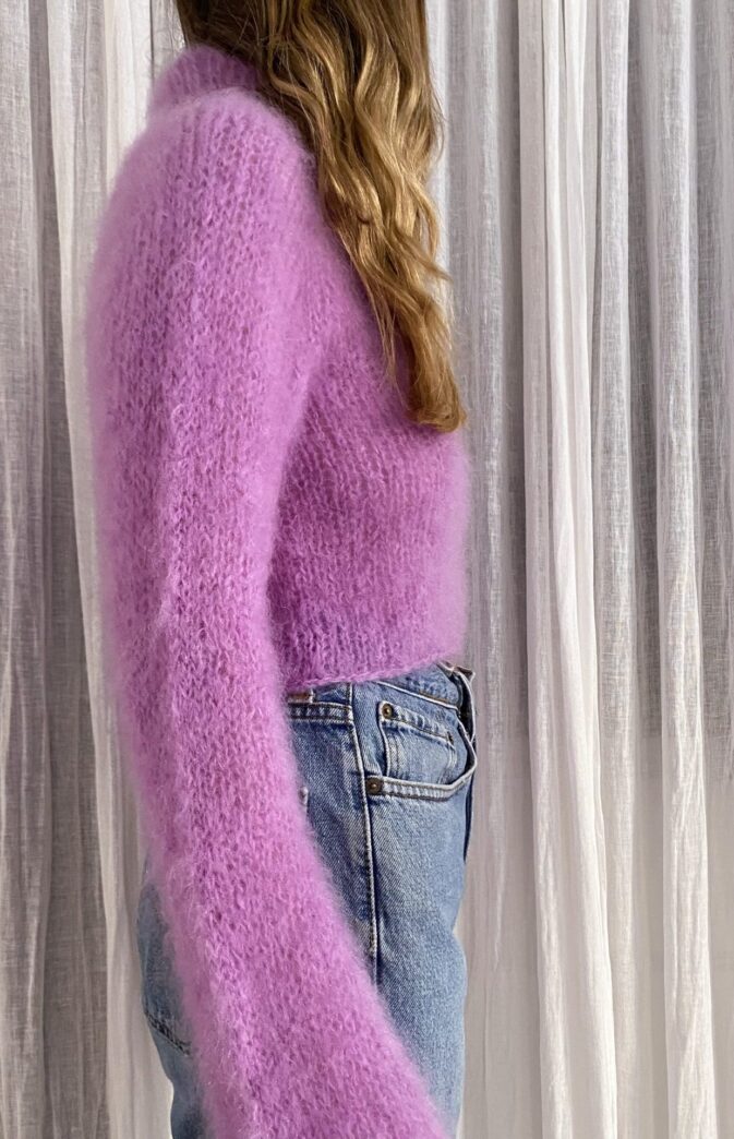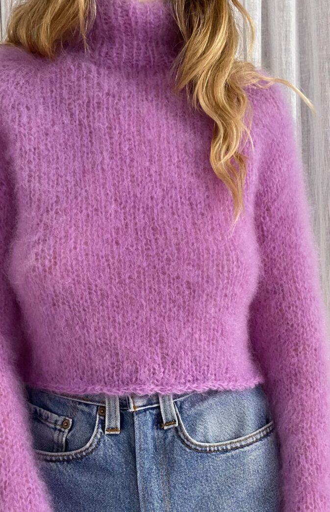 Nina-genseren er en myk, luftig genser med vide ermer og kort kropp. Genseren strikkes ovenfra og ned i Fluff mohair. Mønsteret er nybegynnervennlig.